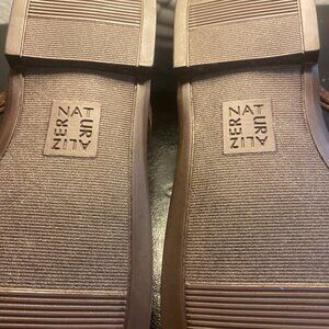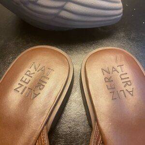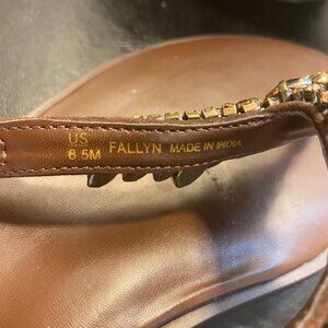 These Naturalizer thong sandals are brown with iridescent rhinestone accents. Shoes have spent their short life in my closet gathering dust! I hyave dusted them and they are ready for a new home!