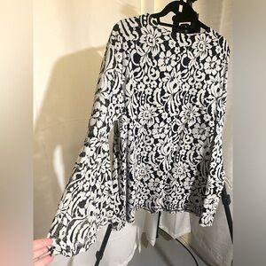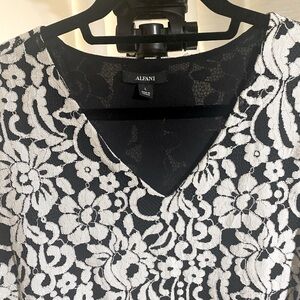 This beautiful Alfani blouse is fully lined Black with white flowers. Is V-neck and ruffle sleeves. would look beautiful with white or black bottoms