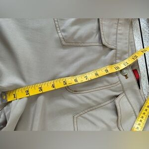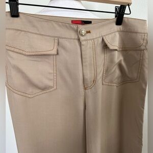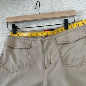 Filomena Fernandez 2 piece Pants Outfit; Pants size US 6-8 or EU 42; check measurements below, Cut out Shoulder top Size S. Tan with Gold stitching accent Front zipper with 2 flapped pockets on each side. Back has 2 open pockets.