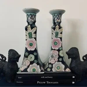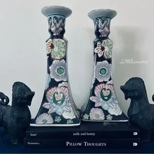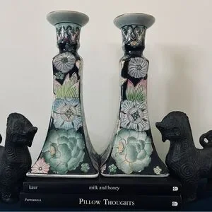 These Vintage Neiman Marcus candle holders feature a striking and elegant design. They are tall and square-based, with a distinct tapering shape that flares out at the top. The ceramic surface is beautifully adorned with intricate floral patterns, primarily in soft pastel colors like green, pink, and blue. The flowers are set against a deep dark blue background, which makes the colors pop vibrantly. The floral motifs appear to be inspired by traditional Asian art, possibly drawing influence from Chinese or Japanese decorative styles. Great for any home decor and collectors. Vintage 1990