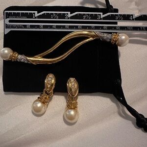 Beautiful, vintage detailed, classic Avon brooch and matching pearl & rhinestone clip earrings