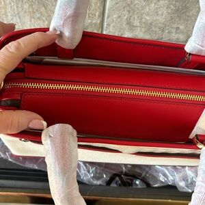 True red and straw. Still in plastic. Crossbody strap included. Middle zip compartment and two side openings. Medium size gorgeous Reed satchel.