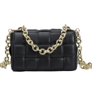 This padded and puffed silhouette was woven by hand and made of premium vegan leather. Inside you'll find a spacious unlined interior and a zip pocket for your trinkets. Carry your bag by the detachable gold wide Rolo chain.