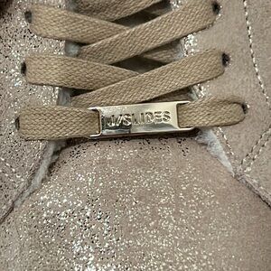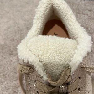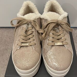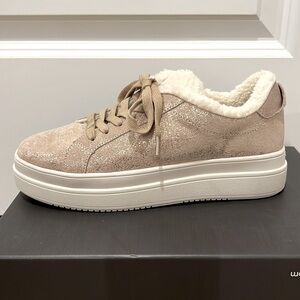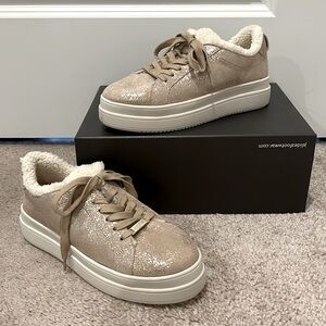 These waterproof gold metallic brush sneakers feature a leather upper and a faux shearling lining and tongue. Cushioned footbed for comfort and a 1.5 inch rubber platform sole for traction.