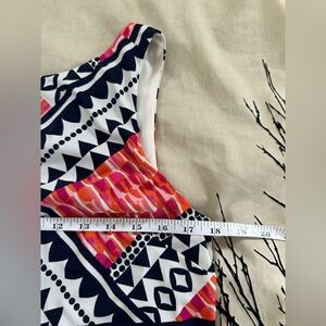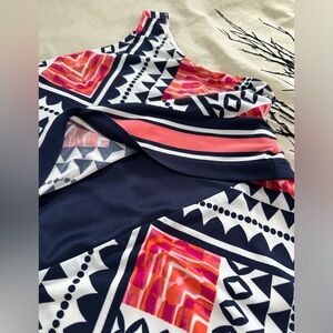 This comes from my personal closet and was one of my favorite dresses. One owner, well cared for. This is a popover dress with a tiered, looser top, full lined. It has an amazing V neck in the back, which I just love. The pattern has an almost tribal look to it, mixed with bright graphic-like pink/orange/coral and navy blue. It’s a stunning dress!