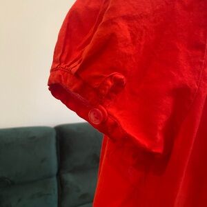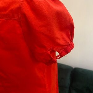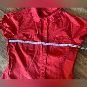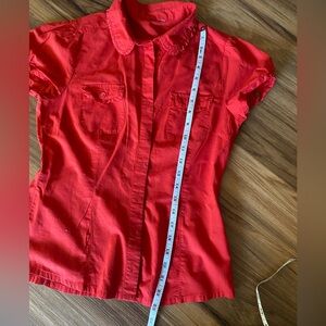 Red dainty, light, short sleeved button brown professional business casual blouse. Note sleeve button detail. See photos for measurements. Previously worn (only by me) in great condition. Smoke free/pet free/child free home. All offers considers!