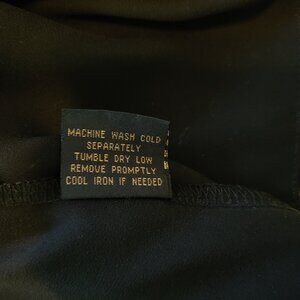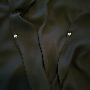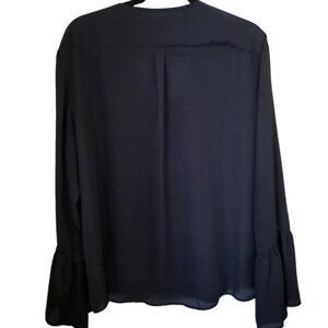 Fabulous fall and winter basic! Black, long sleeve top is your new 'go to' classic to pair with your favorite skirts, pants and jeans. Perfect for travel. This over the head style has a single snap front closure and a loose blouson effect at front hemline. Long bell sleeves with wide band loose ruffle. Worn once (hand washed), this top looks new and is ready to update your wardrobe!
