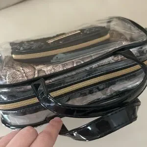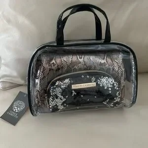 NWT 3 pieces of Vince Camuto cosmetic bags. One clear with black handles, one snakeskin print and one small black and silver sequins bag. Largest bag measures 10” wide and 6” tall