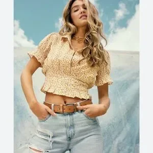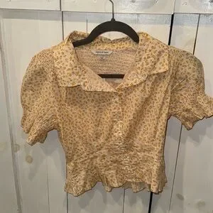 NWT American Eagle Yellow Floral Short Sleeve Button Up Top