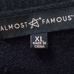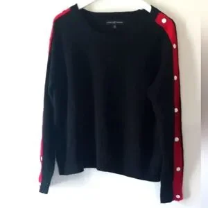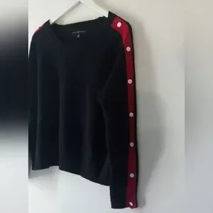 This Almost Famous Black Sweater has a Red Stripe running down each arm which is accented with White Buttons. It's very soft.