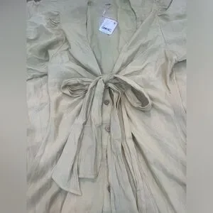 Features: Button-front design, knotted bust detail, subtle puffed sleeves, ruching throughout