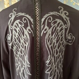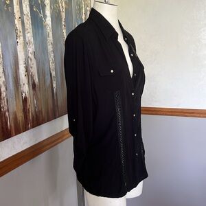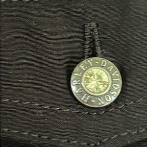 Harley-Davidson Button Down Top; Black with Gray Harley Davidson embroidered on left chest and wing print on back; bilateral front button closure chest pockets; rhinestone studded Harley Davidson Buttons throughout; braided like detail bilaterally down the front sides and center back that expose skin; button up sleeves; measures 19" across armpit to armpit and 27" in length; 100% Rayon; Size M, NWT!
