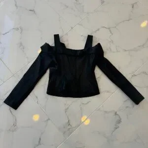 Description: Designed in slick faux leather, a cool cold-shoulder silhouette gives this BCBGMAXAZRIA moto jacket cutting new edge. Straight neckline, shoulder straps, cold-shoulder long sleeves Zip cuffs, front fold-over lapels with snap detail Asymmetric front zip closure, three zip pockets Ponte panels, shaping seams, lined Flat measurements:
