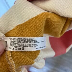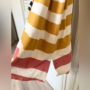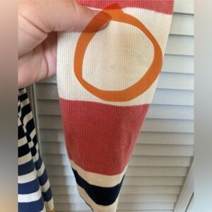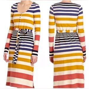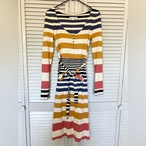 This is a gorgeous long-sleeve, stretchy midi dress by Saturday Sunday for Anthropologie. It has a beige background with horizontal salmon, mustard and navy stripes, and has a button-up scoop neckline. It has a tie at the waist of the same material, and slight slits up the bottom sides.