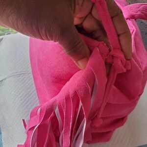 Handmade Ultra Suede pink material. This Puffher Tote Bag with tassles is big and roomy. Approximately 20wx10Hx5D, each strap is 2.5 ft long for shoulder comfort. It has a tie enclosure in the middle and on the sides. A hanging ring to clip your keys to. surprise that comes with the bag. ( when purchase I will tell you) The Puffher bag is overstuffed that gives it a great shape.