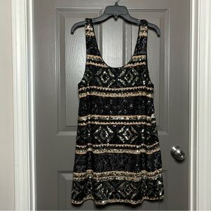 🥂 Free People Fully Sequined Mini Dress Aztec /Geo Design M Black Gold Silver