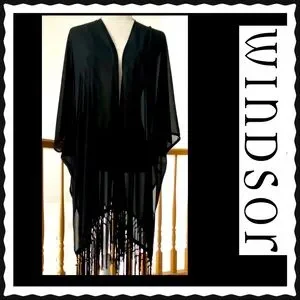 Sheer-Mesh Knotted-Fringe-Hem Kimono. Elevate your style with this sheer fringe kimono from Windsor. This lightweight, airy piece features delicate fringe detailing, adding a touch of boho-chic to any outfit. Perfect for layering over dresses, casual tops, and/or swimsuits, it's versatile and stylish. Features a black-solid color, a sheer-mesh style, a soft and lightweight polyester fabric, three quarter length sleeves, an asymmetrical and knotted-fringe hem, a pull-on closure type, and an open-front style. Material: 100% Polyester. Care: Hand wash with cold water, do not bleach, color separate, hang or line dry, and low iron if needed. Country of Origin: China. Pre-Loved. Condition: Good Condition. Note: Fringe isn’t in perfect condition. Occasion: Casual Wear, Day Wear, Date Wear, Girl’s Night Out Wear, Night Wear, Beach Wear, Pool Wear, Resort Wear, Vacation Wear, and Daily Life. Color: Black. Size: Medium.