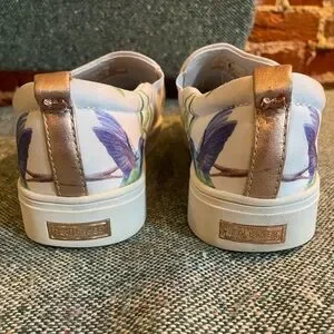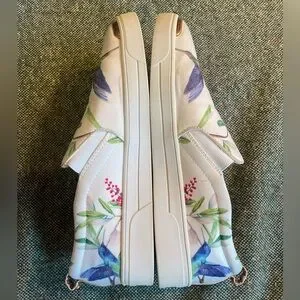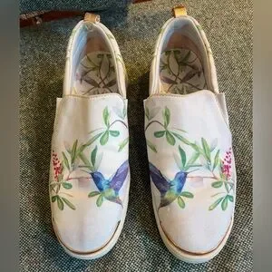 Ted Baker Tancey style hummingbird fabric fashion slip on sneakers with rubber soles and rose gold accents.