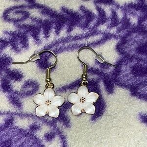 White and gold medal dangle flower earrings posts are gold hypoallergenic and a rubber shopper is included.