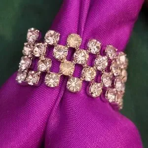Silver-tone metal around a dazzling array of prong-set sparkling rhinestones (watch the video clip!).