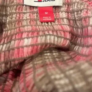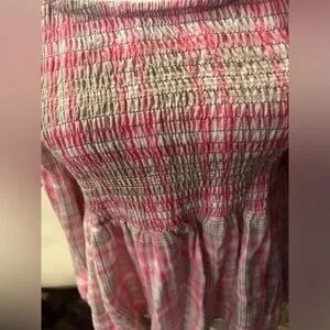 Rosebud plaid peplum blouse with 3/4 sleeve and smocking in the chest.