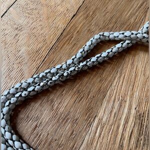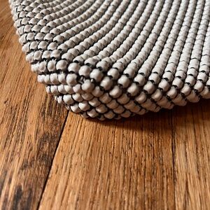 Vintage 1940s Alumesh Beaded Whiting and Davis Purse. Soft flexible, white bead like exterior. Some wear on handle, see photos. Otherwise great condition! Dark blue fabric and small pocket in side. Zipper is in excellent condition. About 11 inches wide at bottom and 7 inches tall. Opening is about 8 inches across.
