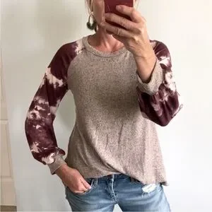 Tie Dye Sleeves Brushed Hacci Top. Super cute, super soft and fun to wear. Purple tie dye and grey colors. Long sleeves. I am modeling size Small. Fit is true to size. 96 polyester 4 spandex. New boutique item.