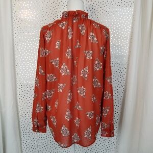 Loft semi sheer orange floral long sleeve top. V-neck with a ruffled collar that ties. 100% Polyester. Size small.