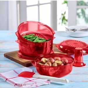 🍽❤️🍲NWT‼️ Tupperware brand Microwave Stack Cooker in Red. Cook 3 courses in the same product. Save time and energy, and keep the house cool, all while using the microwave instead of the oven or cooktop.