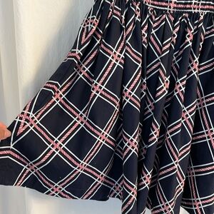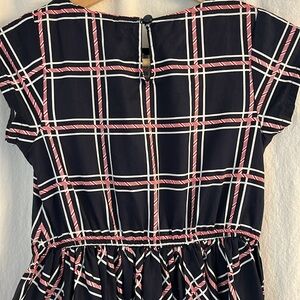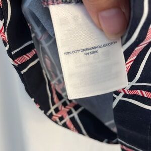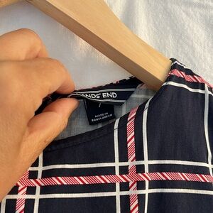 Beautiful Lands End dress worn twice for the holiday season. Navy blue with red white and pink geometric designs. Kind of like a candy cane design. Capped sleeve with a beautiful buttoned closure in back. This dress is super soft and 100% cotton. It would be perfect for the holidays. Size is 7 but Lands End usually runs big.