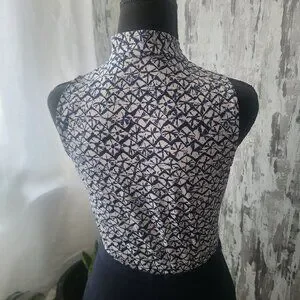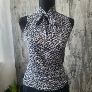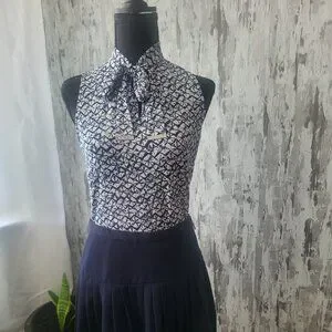 Sleeveless, halter neckline extends to a collared front bow tie, blue geometric print. Like new without tags. Preowned. No flaws.