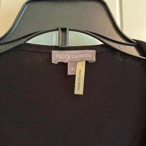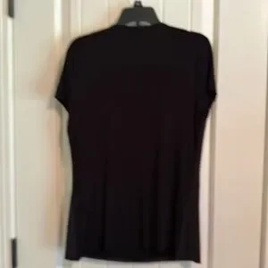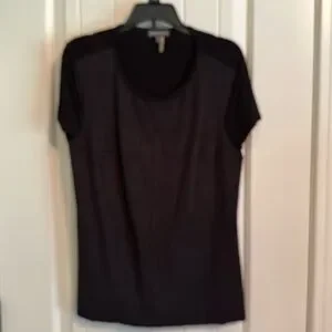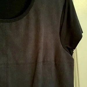Very chic - photos don't do it justice! Black rayon, polyester and spandex v-neck lined faux suede top. The front has paneled sueded fabric sections to give it a modern edge. Very short sleeves. EUC, worn only a couple of times. No rips/tears/stains or odors. Great dress up or dress down top!