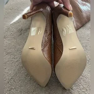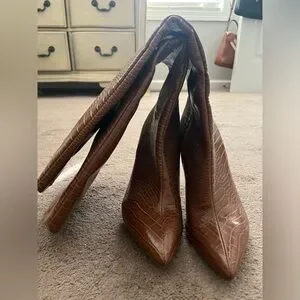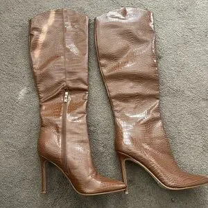 Never worn. Knee high. Croc-embossed faux leather texture. Stiletto heels. Inner ankle zipper. Pointed toe. Comes with duster bags. Not for wide calf.