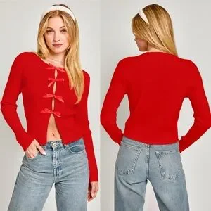 It looks like the coquette trend is here to stay and I am SO excited for it. This sweater style has been stocked in short sleeve and now it’s time to bring in the long sleeves for Fall. This red long sleeve knit sweater has the cutest bows in the front the give fit the coquette look while the exposed skin definitely ups the wow factor in this style. This sweater is perfect for a cute date night outfit or can definitely be you NON ugly Christmas sweater.
