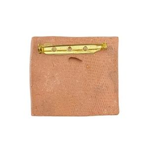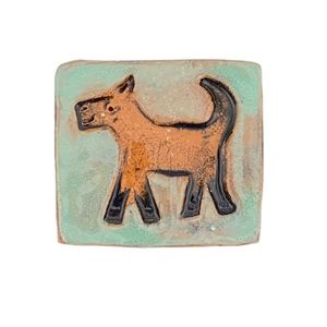 Unique piece of wearable art. NWOT. Handmade pottery pin brooch featuring a dog. Glazed with a sea foam green, black and terra cotta orange accents. It measures approximately 2” x 2” x 1/4”. It is a beautiful piece of work. I purchased this at an art fair and it is new and unused.