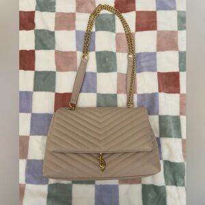 Neutral colored/ tan chevron quilt faux leather bag. Long gold chain strap and cute gold details throughout. Snaps closed with magnetic closures. Only used once or twice.