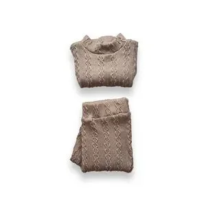 Cute 2-piece set featuring a taupe-colored cable knit long-sleeve mock-neck crop top & matching stretchy high-waisted skinny pants w/ an elastic waistband
