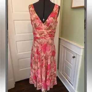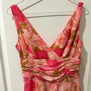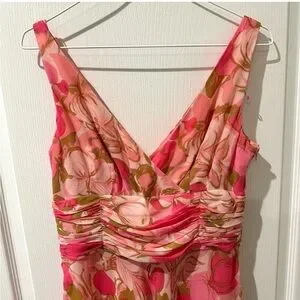 Pink peach coral Floral Silk Chiffon Sleeveless Dress by Maggie London. V-Neckline, Ruched Waist and Full Flowy Skirt. Lined. Hidden side zipper. 90's vintage.