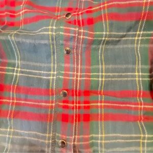 Colors of green ,red and white on this snap front long sleeve dress. Dress has 2 dude pockets. Pit/pit is 27” and dress length is 47” from neckline to hem. 109% cotton. Preowned and still has tag on it.
