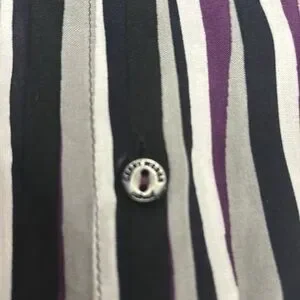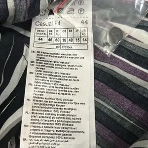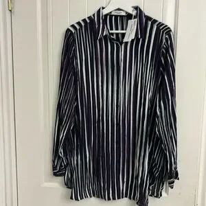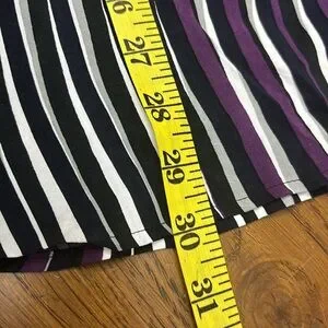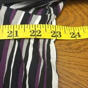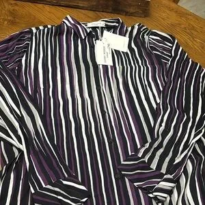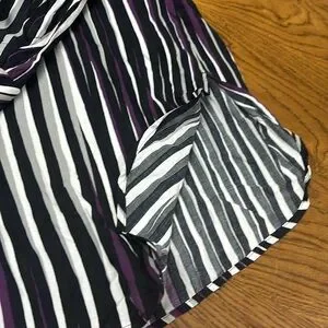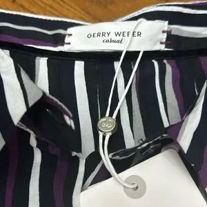 Size 14 BNWT GERRY WEBER long sleeve top. This is stunning in deep purple , black, white and grey blurred stripes. Collar and buttons at front and cuffs . Slits on both sides at bottom. Made in Turkey and 100% viscose .