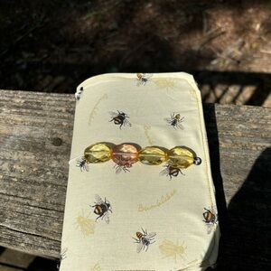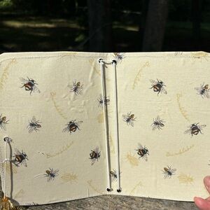 Bee travel notebook caries up to 5 mini note books on the inside for light reading measurements are 5x7 small enough to put in your bag. This has a cute bee design on the outside side with autumn color bead closure. Handmade.