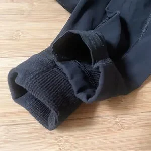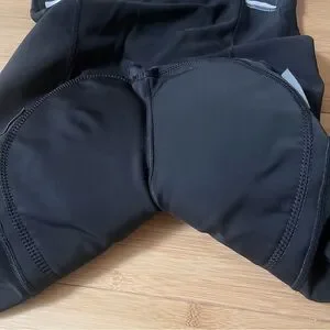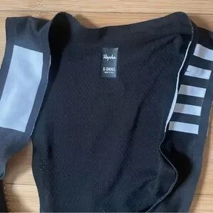 Men’s anatomically-specific chamois is in great condition (I have always worn underwear under these so rest assured they are clean!), minimal if any fabric pilling at the seams, no fabric abrasion areas, and upon very close inspection inside and out there is just a small snag hole on the back side of the left calf, shown in picture under the white Rapha, and another tiny hole that doesn’t go all the way through between the H and A in that area of that leg.
