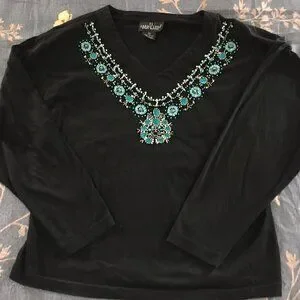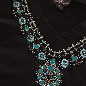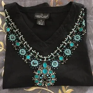 Great pullover black shirt with turquoise silver beading that would look amazing with jeans and boots. Or dress it up with a complimenting skirt.