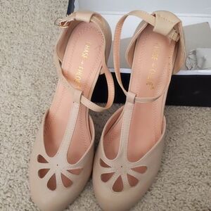 very vintage T-Strap nude heels. worn twice. some scuff marks from wear. Very comfortable and reasonable height. size 10 shoes. comes with box