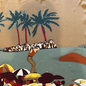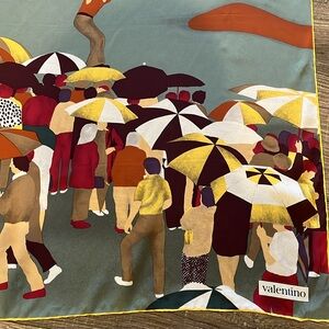 Valentino Classic Silk Scarf has Golf Tournament scene. Rich tones of golden brown, sienna, and green. The edges of this authentic and elegant piece are piped in gold. Logo placed at bottom left of scarf. 35” square and without flaws!
