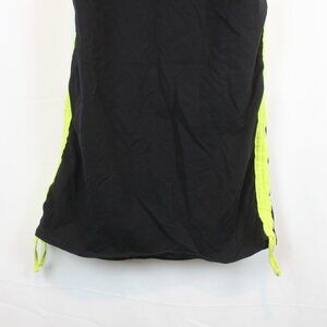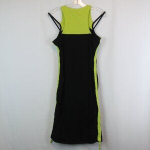 Sleeveless black and neon green dress. Peak-a-boo opening on the chest. Sides of the dress have pull strings on the bottom to scrunch the dress up to a length you'd like. Dress is stretchy and form fitting.