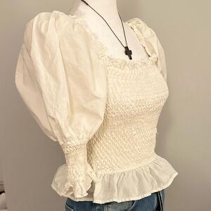 Super cute peplum top. Zipper in the back. Worn one time to a trip to Spain. Received lots of compliments! Very small dot stain on sleeve. Just noticed when putting it in the mannequin. Not really noticeable. See last pic.