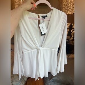 White Romper with Bell Sleeves, a Deep V Cut, and tie detailing