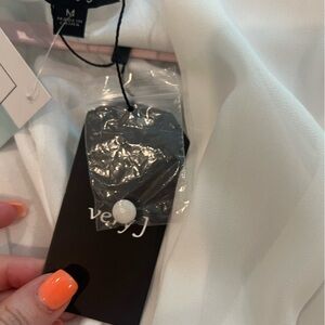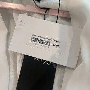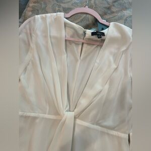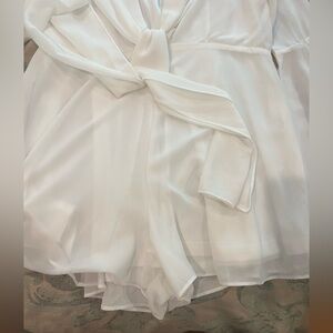 White long sleeve flowy romper with plunge neck and front tie detailing. There is a double layer in the shorts!