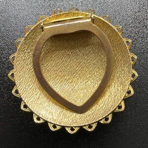 This gorgeous gold tone round filigree brooch by LIEBA USA is circa 1960s or early 1970s. I love that their fashion pieces were clips instead of traditional stick pins, because they never leave a hole in clothing, or anything you attach them to. Clip this beautiful brooch on your clothing, scarf, bag- options are endless.